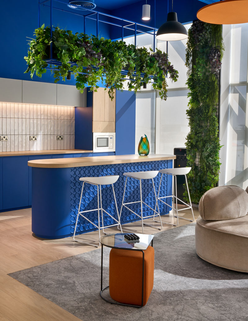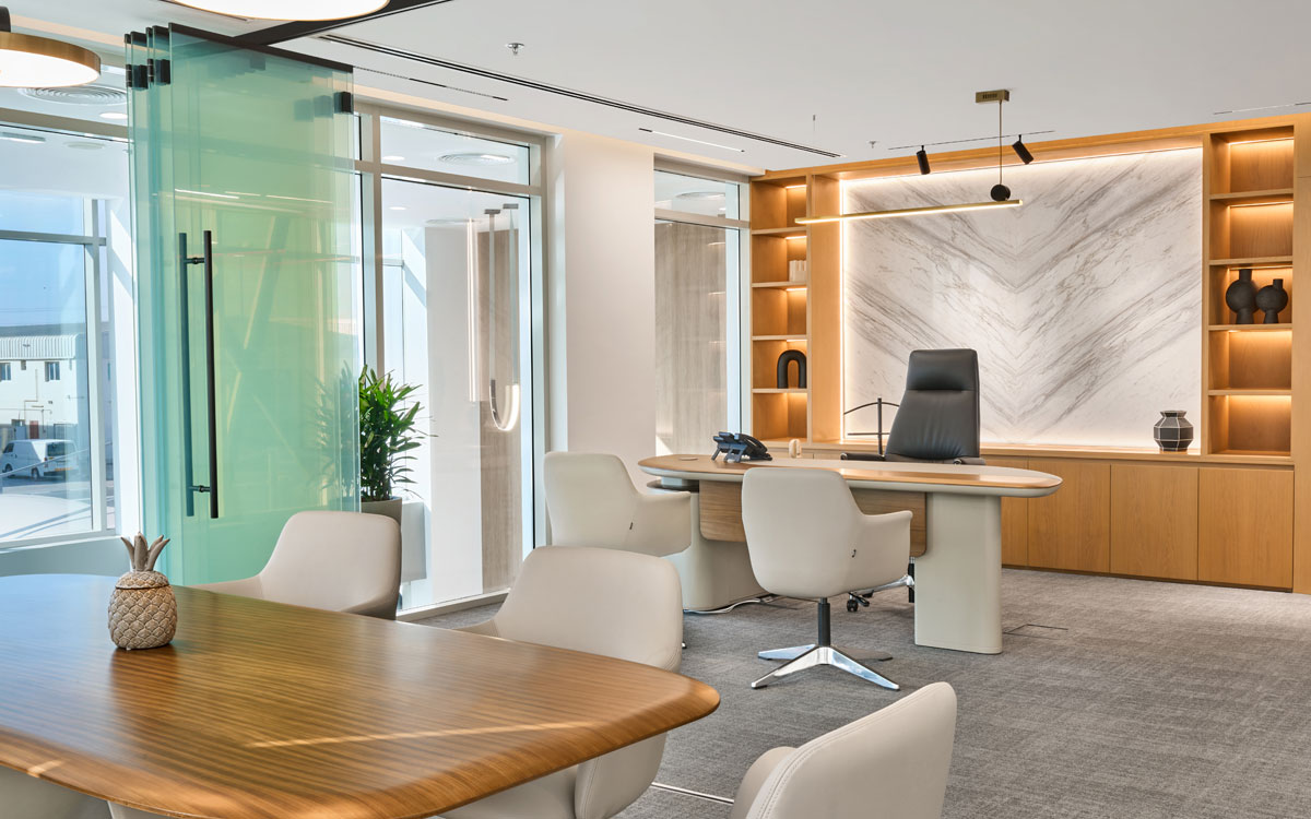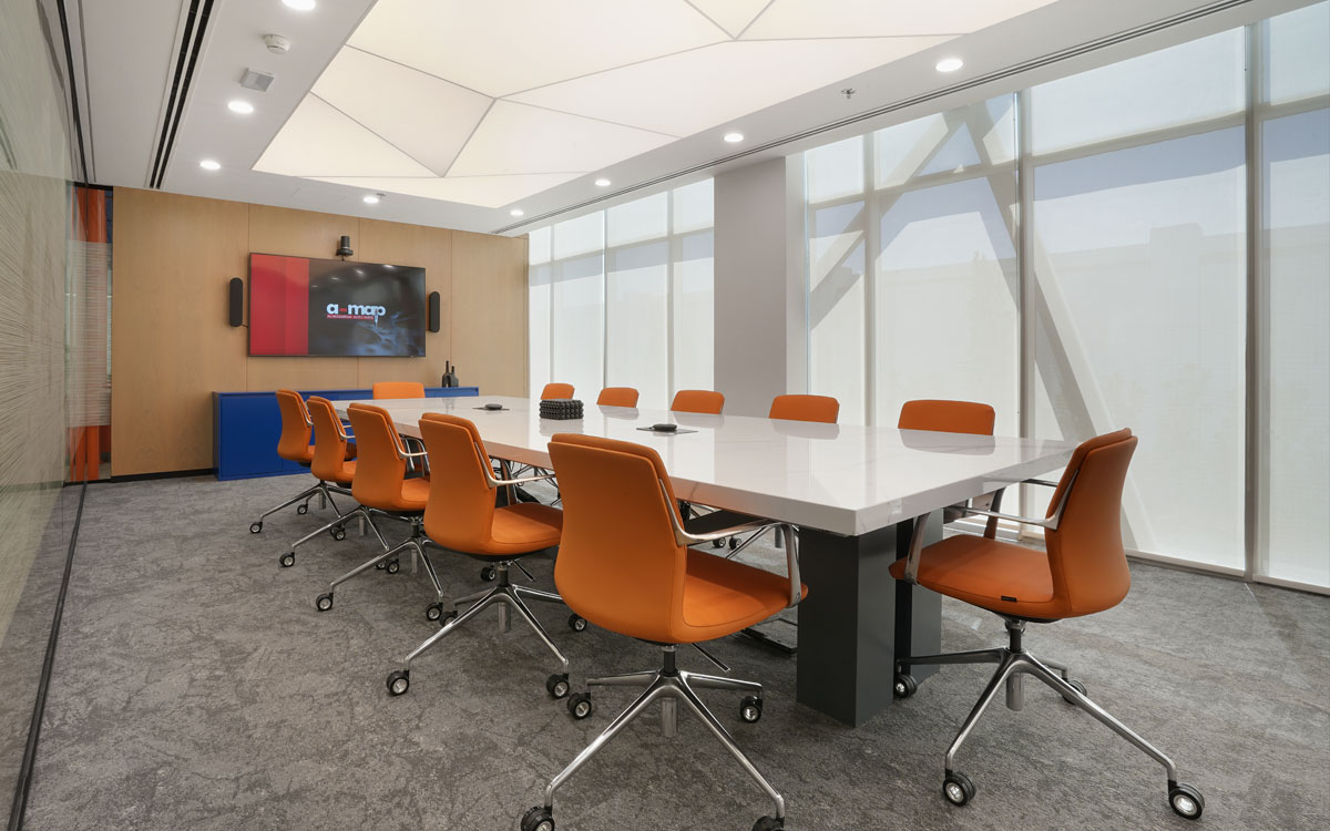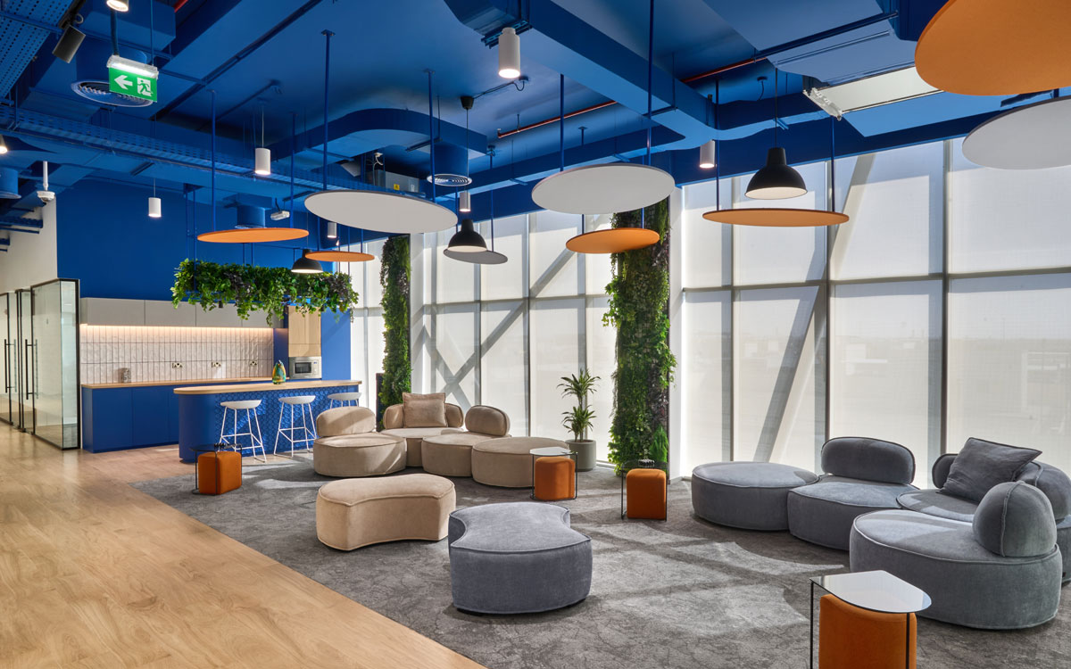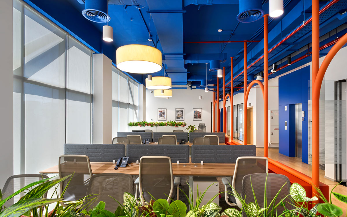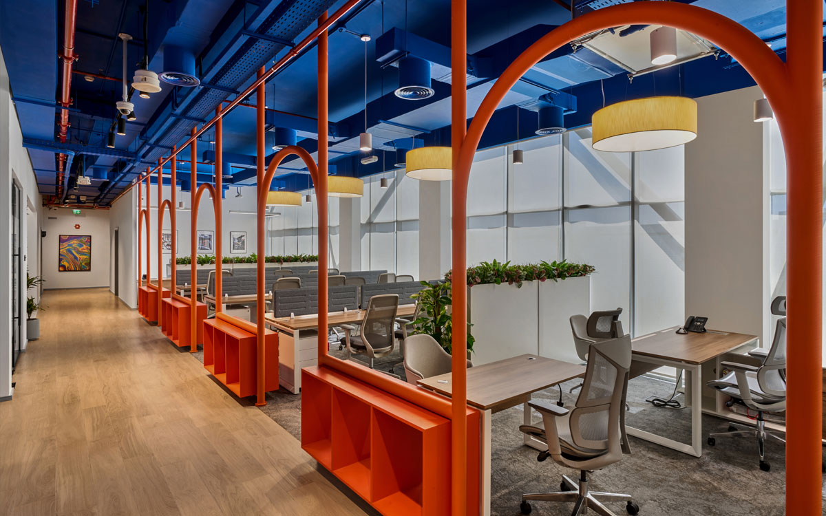 This office by Binay Design features a vibrant blue and orange palette, promoting energy and professionalism. The open-plan space is filled with natural light & includes ergonomic furniture for comfort. While subtle lighting and tech solutions support productivity. Design balances aesthetics & functionality for an inspiring workspace.